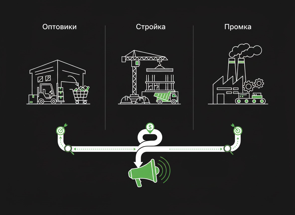 Давайте соберём всё выше и посмотрим на оптовика, строителя и промку отдельно. Не с точки зрения романтики, а с точки зрения настройки.